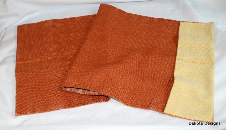 The edges are hand stitched with a blanket stitch using one of the weft colors. The pockets have a centered decorative stitch which gives you a 2 slot pocket.